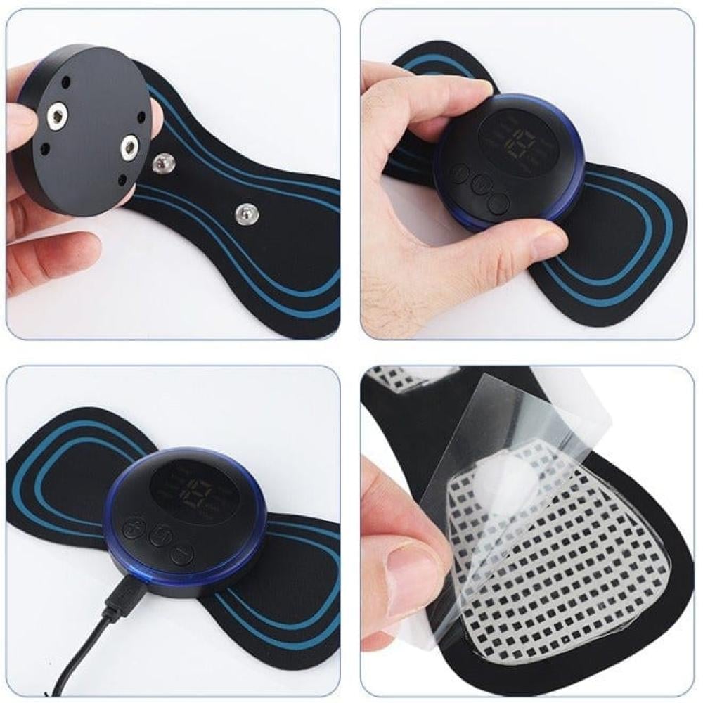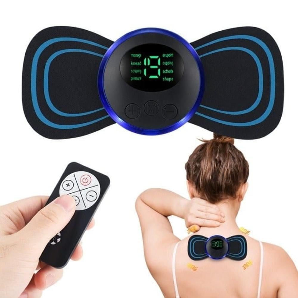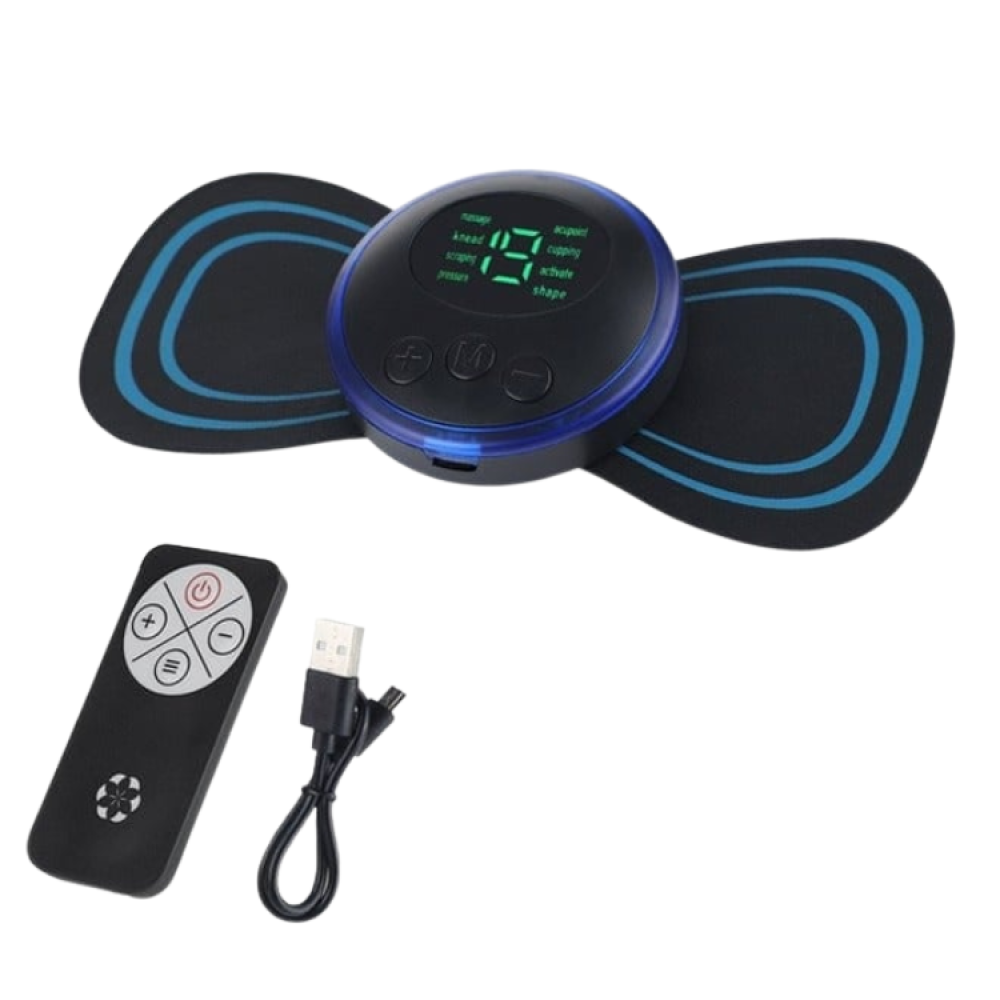 جهاز تدليك ذكي مزوّد بشاشة LCD لعرض الإعدادات والأنماط، يعمل بتقنية TENS/EMS لتخفيف التوتر العضلي وتنشيط الدورة الدموية.