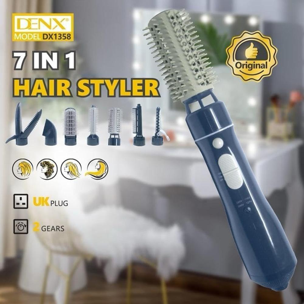 جهاز تصفيف الشعر المتكامل من DENX بسبعة ملحقات مختلفة لتجفيف، تمليس، وتشكيل الشعر بكل سهولة. يتميز بمحرك قوي بقوة 3500 واط، سرعتين تشغيل، وقابس UK، مع جودة اورجن لتجربة تصفيف آمنة واحترافية.