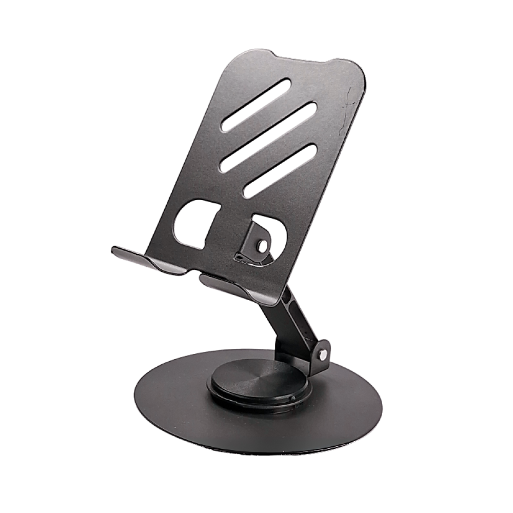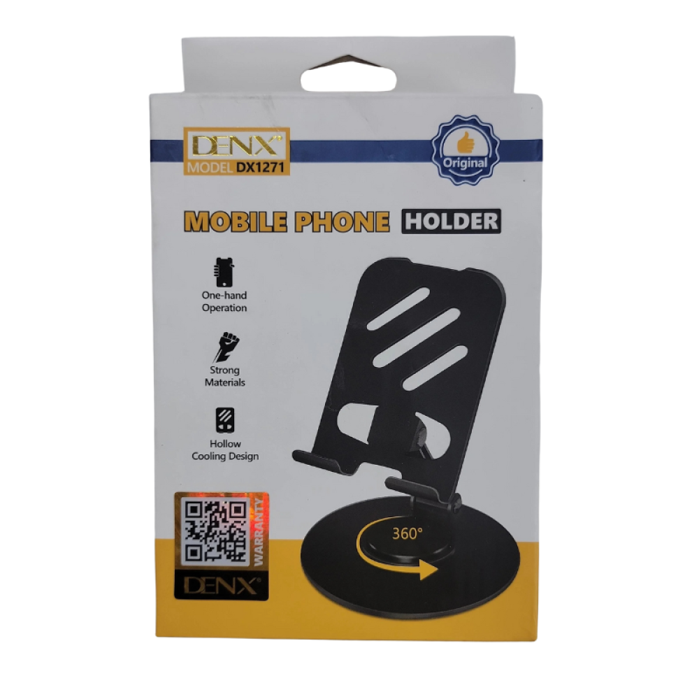 حامل جوال مكتبي من DENX بتصميم قوي وقاعدة ثابتة تدور 360 درجة، مصنوع من خامات متينة ويوفر تهوية ممتازة للجهاز. مثالي للاستخدام على المكتب أو الطاولة لتسهيل مشاهدة الفيديو والمكالمات.