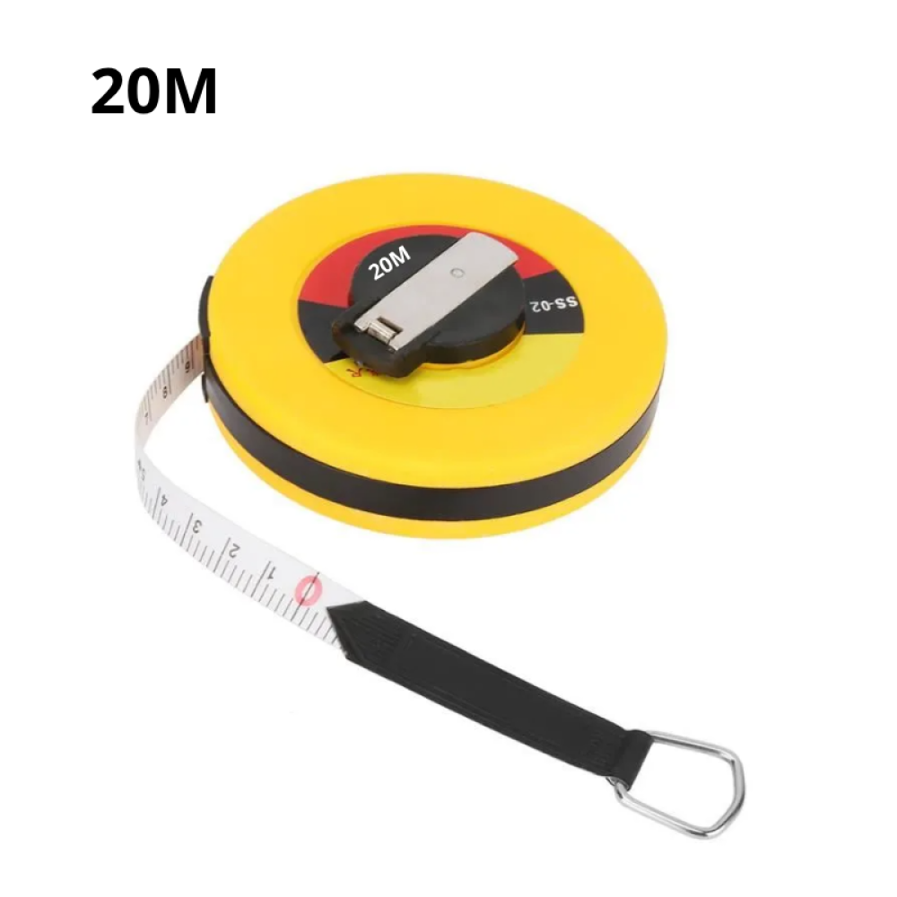 شريط قياس متين بطول 20 متر، مثالي للاستخدام في الأعمال المنزلية أو الحرفية أو الهندسية. يتميز بتصميم عملي وقابل للطي لسهولة التخزين والنقل.