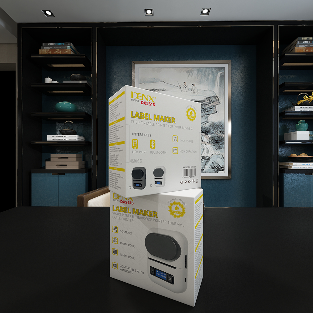 طابعة ملصقات حرارية محمولة من DENX م/ DX2515، صغيرة الحجم وذكية لطباعة الباركود والملصقات الحرارية بسرعة وكفاءة. تدعم رول 40 مم ومتوافقة مع أنظمة ويندوز، مع شاشة LED لسهولة المتابعة والاستخدام اليومي.