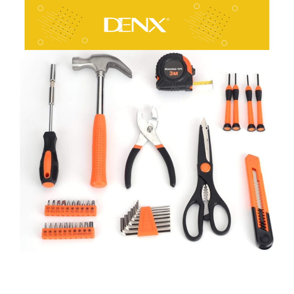 طقم أدوات منزلية من DENX يحتوي على 39 قطعة متنوعة في حقيبة صلبة لتنظيم الأدوات، يلبي مختلف احتياجات الإصلاح والصيانة اليومية في المنزل أو المكتب. تصميم عملي، متين، وسهل الحمل، ويعد خيارًا مثاليًا من اورجن للمبتدئين والمحترفين في أعمال الصيانة.