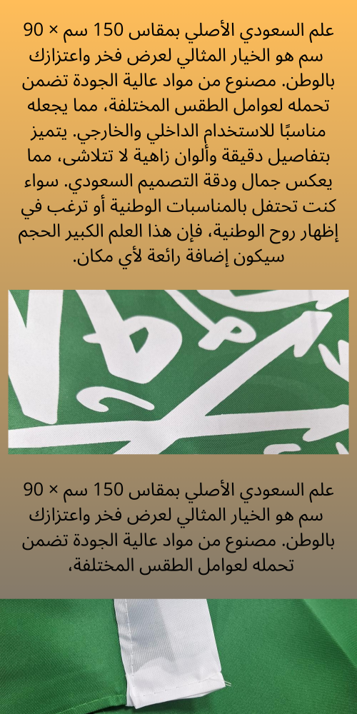 علم السعودي الأصلي بمقاس 150 سم × 90 سم هو الخيار المثالي لعرض فخر واعتزازك بالوطن. مصنوع من مواد عالية الجودة تضمن تحمله لعوامل الطقس المختلفة، مما يجعله مناسبًا للاستخدام الداخلي والخارجي. يتميز بتفاصيل دقيقة وألوان زاهية لا تتلاشى، مما يعكس جمال ودقة التصميم السعودي. سواء كنت تحتفل بالمناسبات الوطنية أو ترغب في إظهار روح الوطنية، فإن هذا العلم الكبير الحجم سيكون إضافة رائعة لأي مكان.