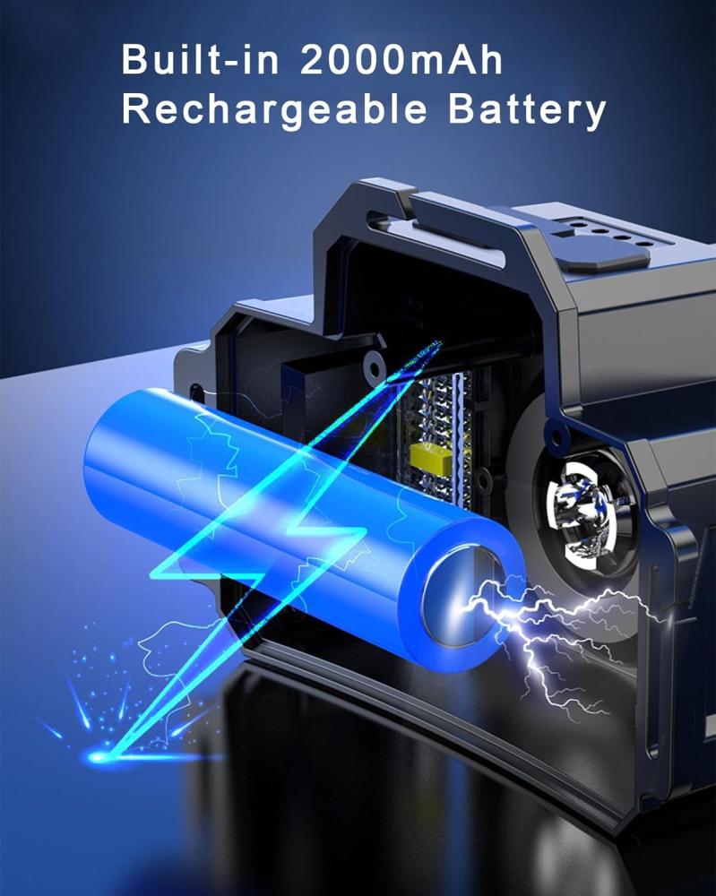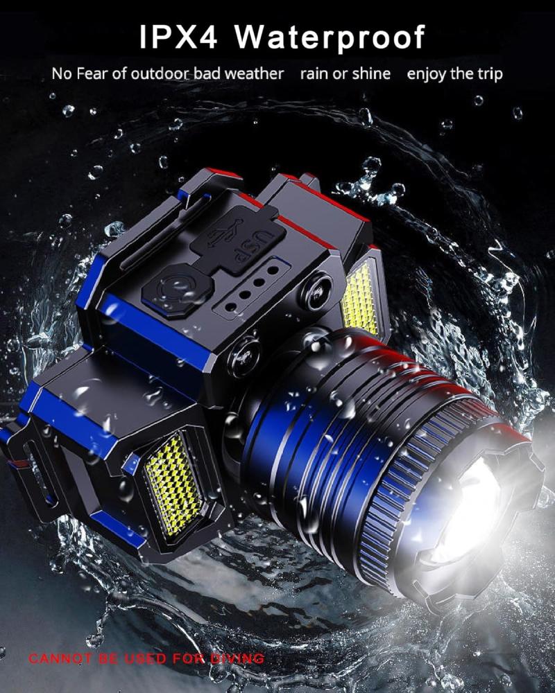 كشاف رأس عملي بإضاءة LED عالية الوضوح، مزود بحساس حركة لسهولة التشغيل، ويتميز بإمكانية الشحن عبر USB مع مؤشر للبطارية. مناسب للأنشطة الخارجية والعمل في الإضاءة المنخفضة.