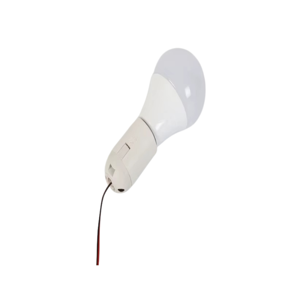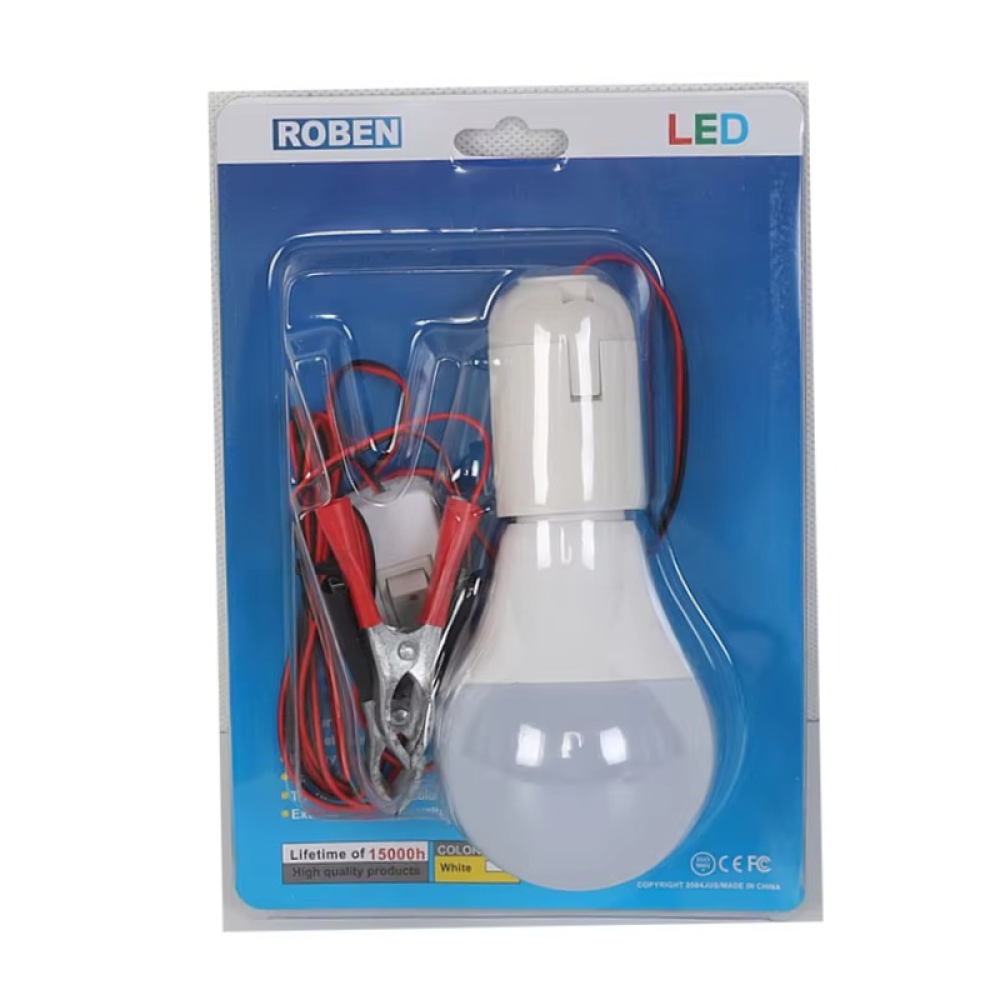 لمبة إضاءة LED تعمل على بطارية 12 فولت، مزوّدة بمشابك توصيل لسهولة الربط، مناسبة للاستخدام في الرحلات، الطوارئ، وأعمال الصيانة.