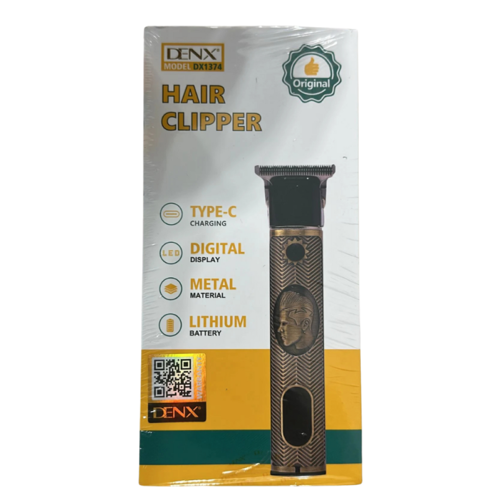 آلة حلاقة شعر احترافية من DENX م/ DX1174، مصنوعة من المعدن وتدعم الشحن السريع عبر Type-C مع شاشة رقمية لعرض حالة البطارية. مزودة ببطارية ليثيوم قوية وتصميم معدني أنيق لسهولة التحكم ودقة الحلاقة.