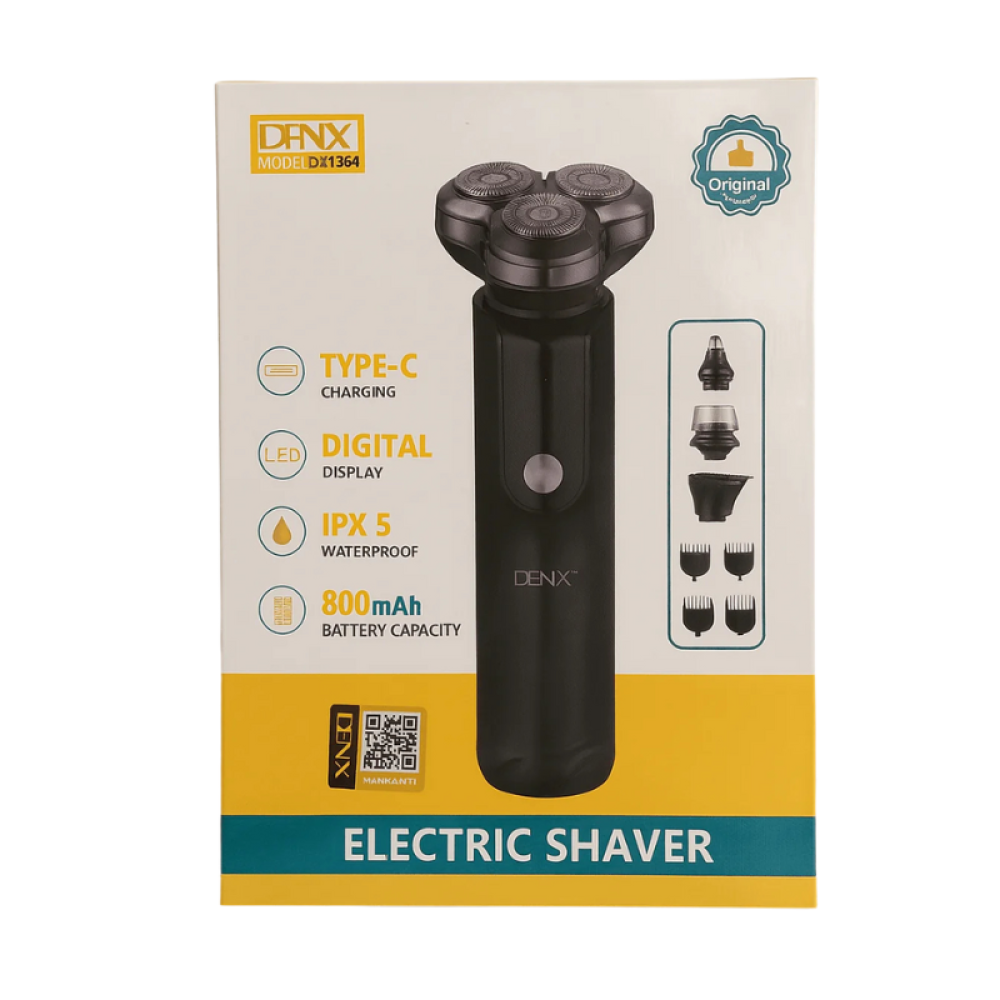ماكينة حلاقة كهربائية من DENX م/ DX1364، بتصميم رقمي حديث تدعم الشحن عبر Type-C وتوفر شاشة رقمية لعرض حالة البطارية. مقاومة للماء بمعيار IPX5، وتأتي بسعة بطارية 800mAh مع مجموعة رؤوس متنوعة للحلاقة والتشذيب.