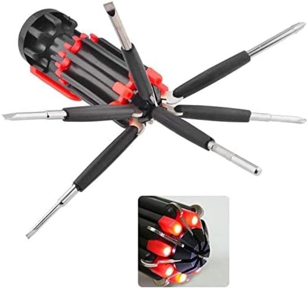 مفك عملي متعدد الوظائف يحتوي على 8 رؤوس مختلفة مدمجة في تصميم واحد، مع إضاءة LED لتسهيل العمل في الأماكن المظلمة.