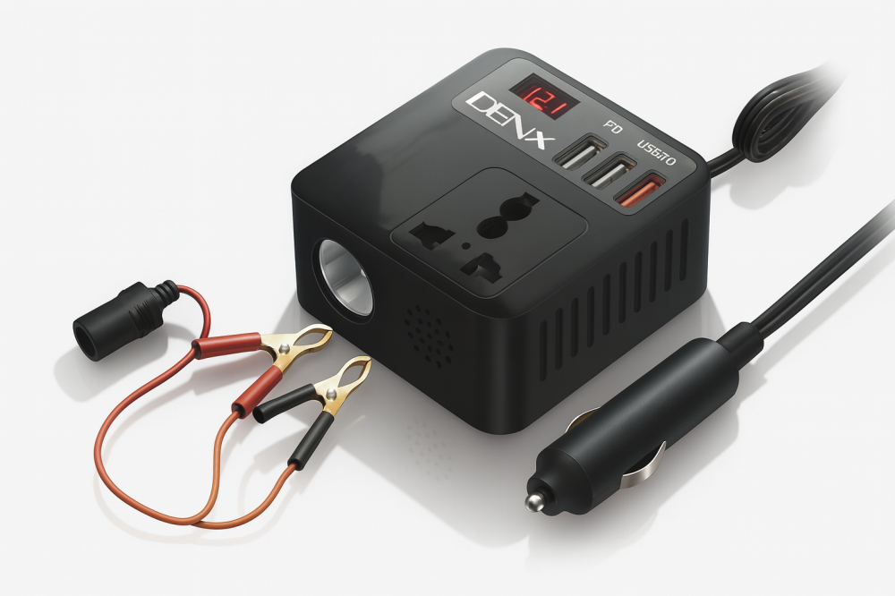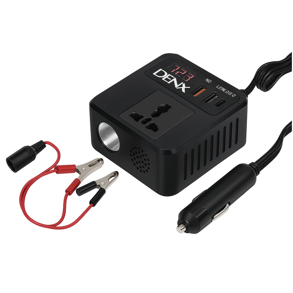 محول كهربائي بقدرة 100 واط من DENX يمنحك مخرج 220V من ولاعة السيارة، مزود بمنافذ متعددة للشحن لتوفير تجربة استخدام عملية أثناء السفر أو الطوارئ.