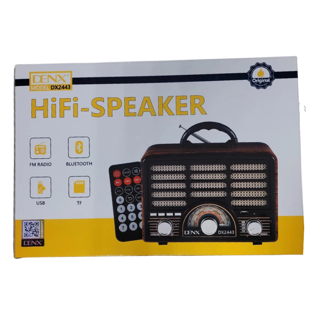 مكبر صوت عالي الجودة HiFi من DENX بتصميم كلاسيكي أنيق، مزود براديو FM ويدعم تشغيل الموسيقى عبر البلوتوث وUSB وTF. يأتي مع جهاز تحكم عن بعد لسهولة الاستخدام في المنزل أو أثناء التنقل.